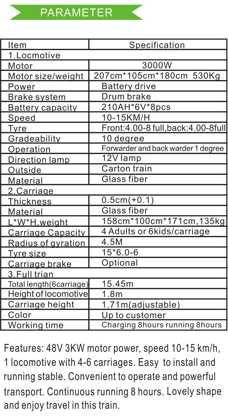 What presents you is the miniature train. With 3 KW motor in the locomotive, the train is able to run in different occasions and has widely use. It must be a convenient and environmental vehicle what you need.